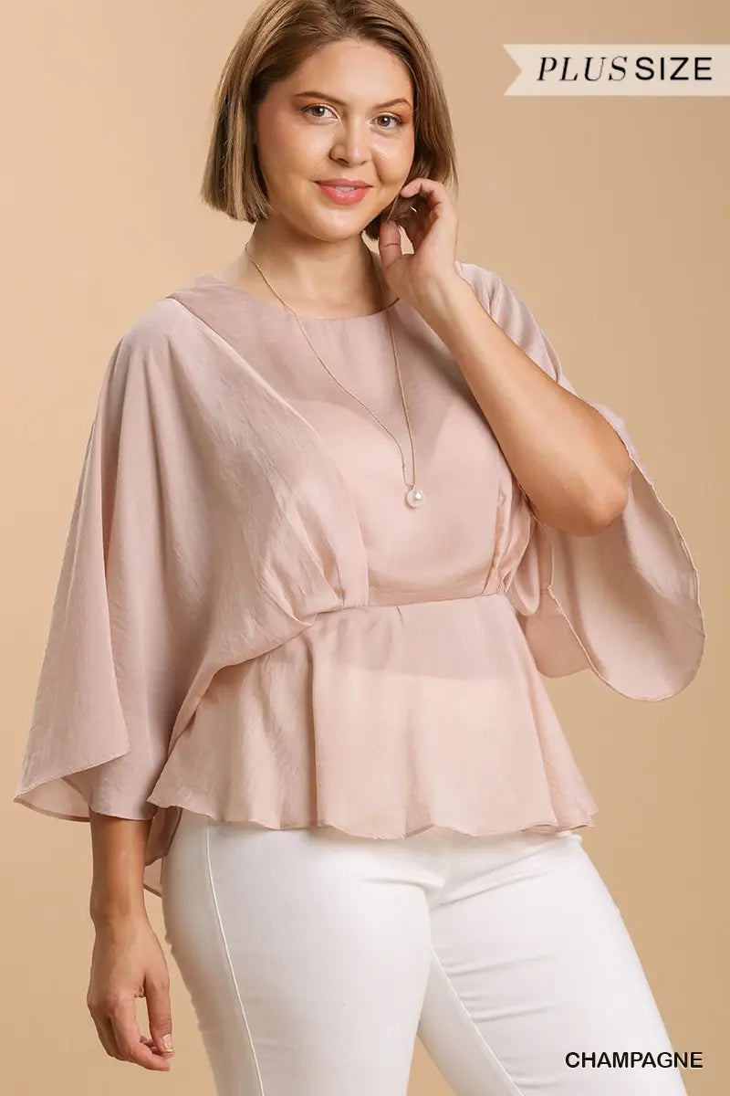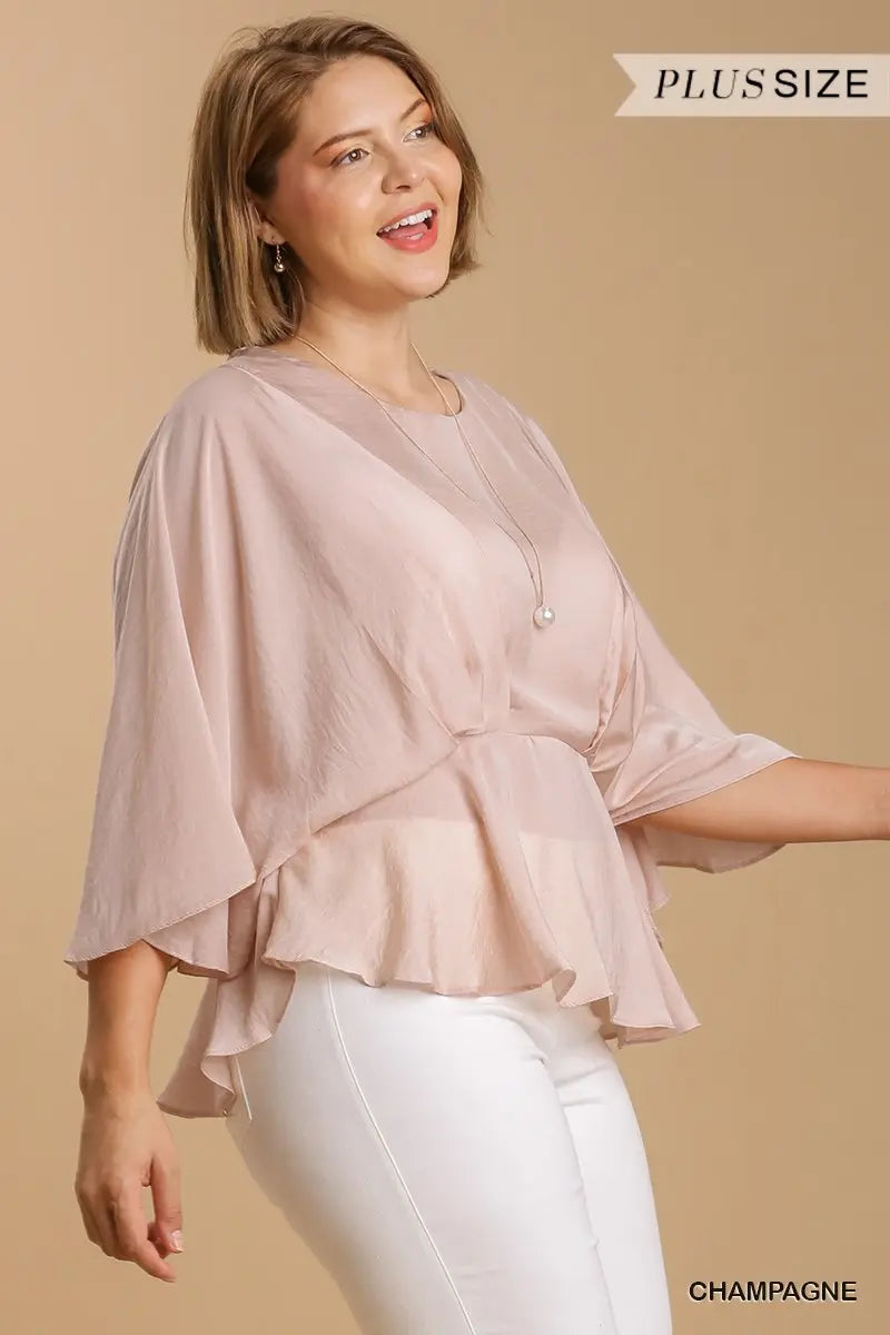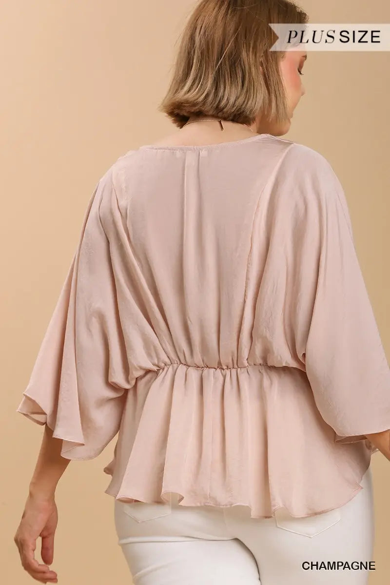Washed Satin Pleated Round Neck Kimono Sleeve Top with Peplum Hem