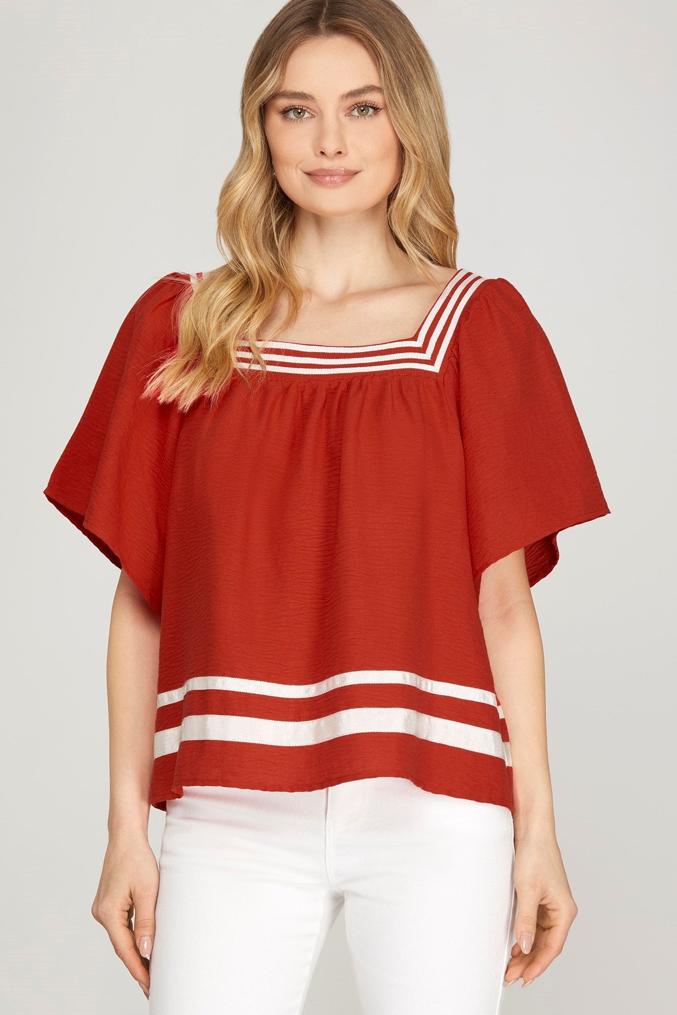 Experience ultimate comfort and style with our Gemma Gameday Top. This top features a woven design and contrast tape details, providing a unique and eye-catching look. Step up your game with this must-have addition to your wardrobe.