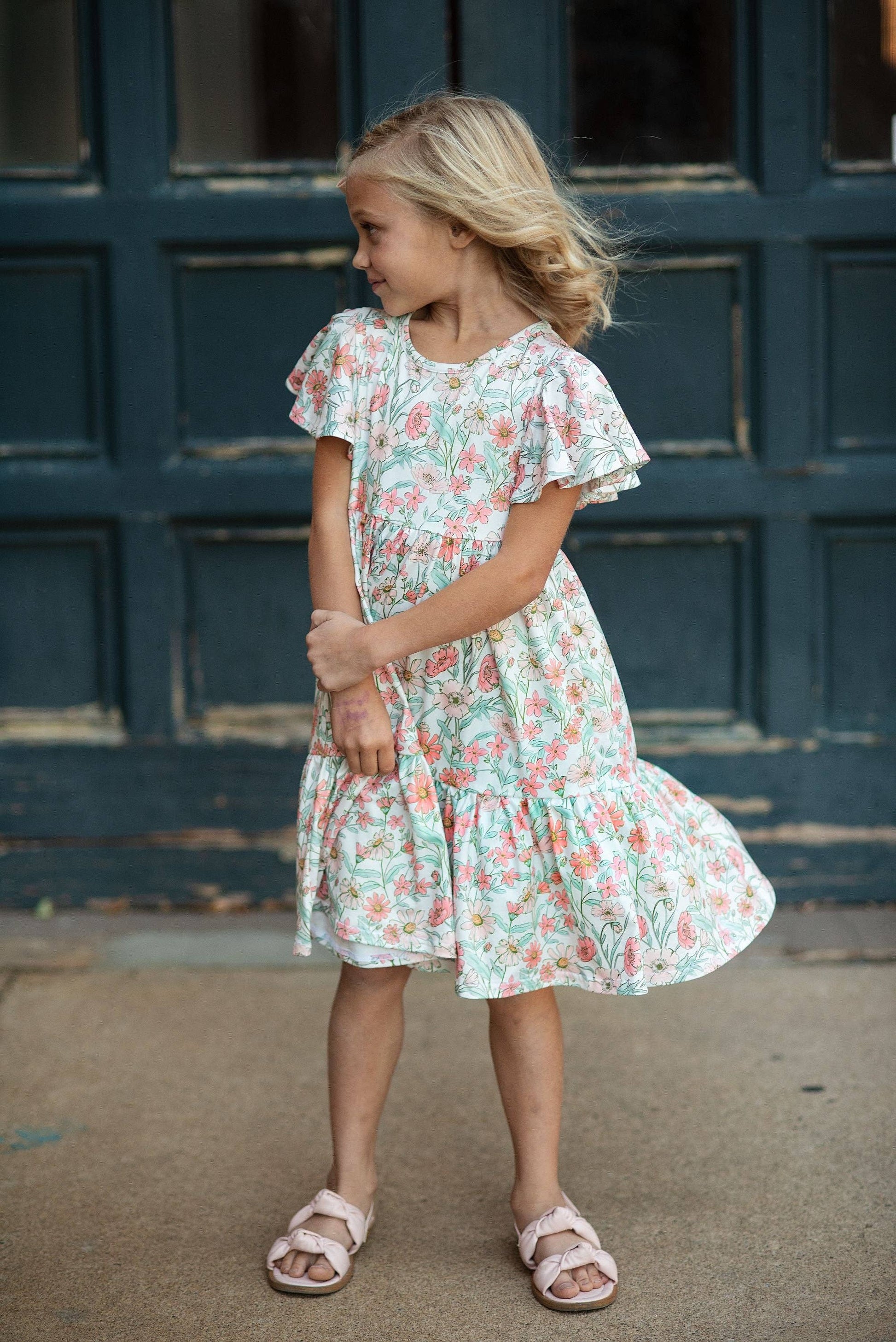 Girls beige vintage floral print dress with flutter sleeves.